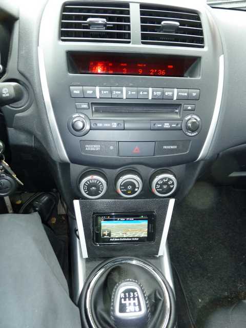 Hier mal ein Bild von der ersten provisorischen Lösung, ich werde das schwarze Tape gegen einen Überzug aus mattem Kunstleder passend zu den Armaturen des ASX austauschen... dann sieht es professionell aus.(Bekommt man sogar bei der Menge beim Sattler geschenkt )