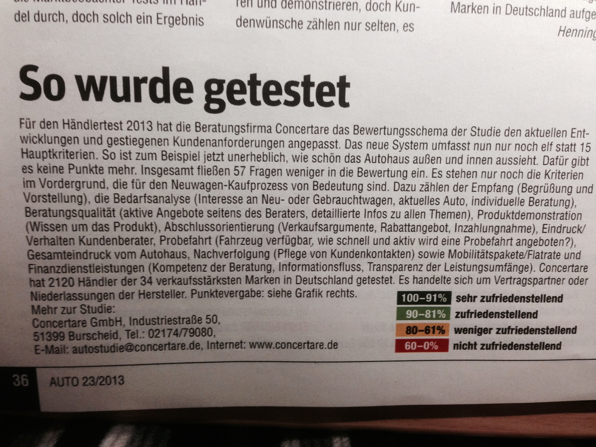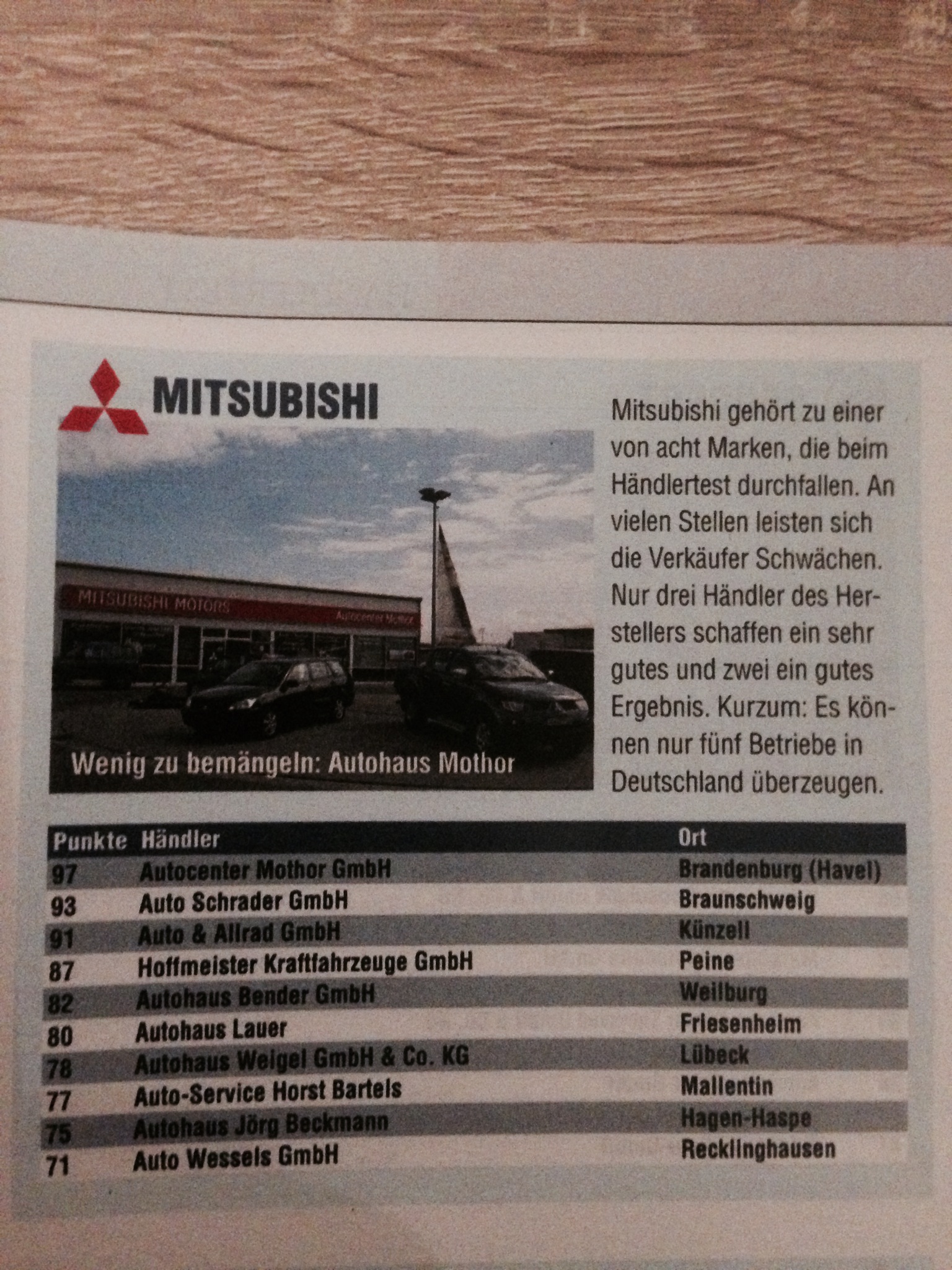 • Die Beratungsfirma Concertare führte für die Autozeitschrift "Auto Strassenverkehr" einen Händlertest in 2013 bei 34 Herstellern u.a. MB, VW, Audi, Lada .... und eben auch Mitsubishi durch. Im Endergebnis fielen ACHT Marken durch - darunter auf Platz 27 auch Mitsubishi ...... leider ...... weitere Infos können den Anhängen entnommen werden. Ob eventuell euer Händler betroffen ist könnte ebenso aus dem Anhang entnommen werden. Leider wurden nicht alle getesteten Händler veröffentlicht. Meiner Meinung nachfehlen da noch ein paar mehr. Insgesamt wurden 2210 getestet durch 34 Marken macht nach Adam Riese 65 Händler je Marke ....
