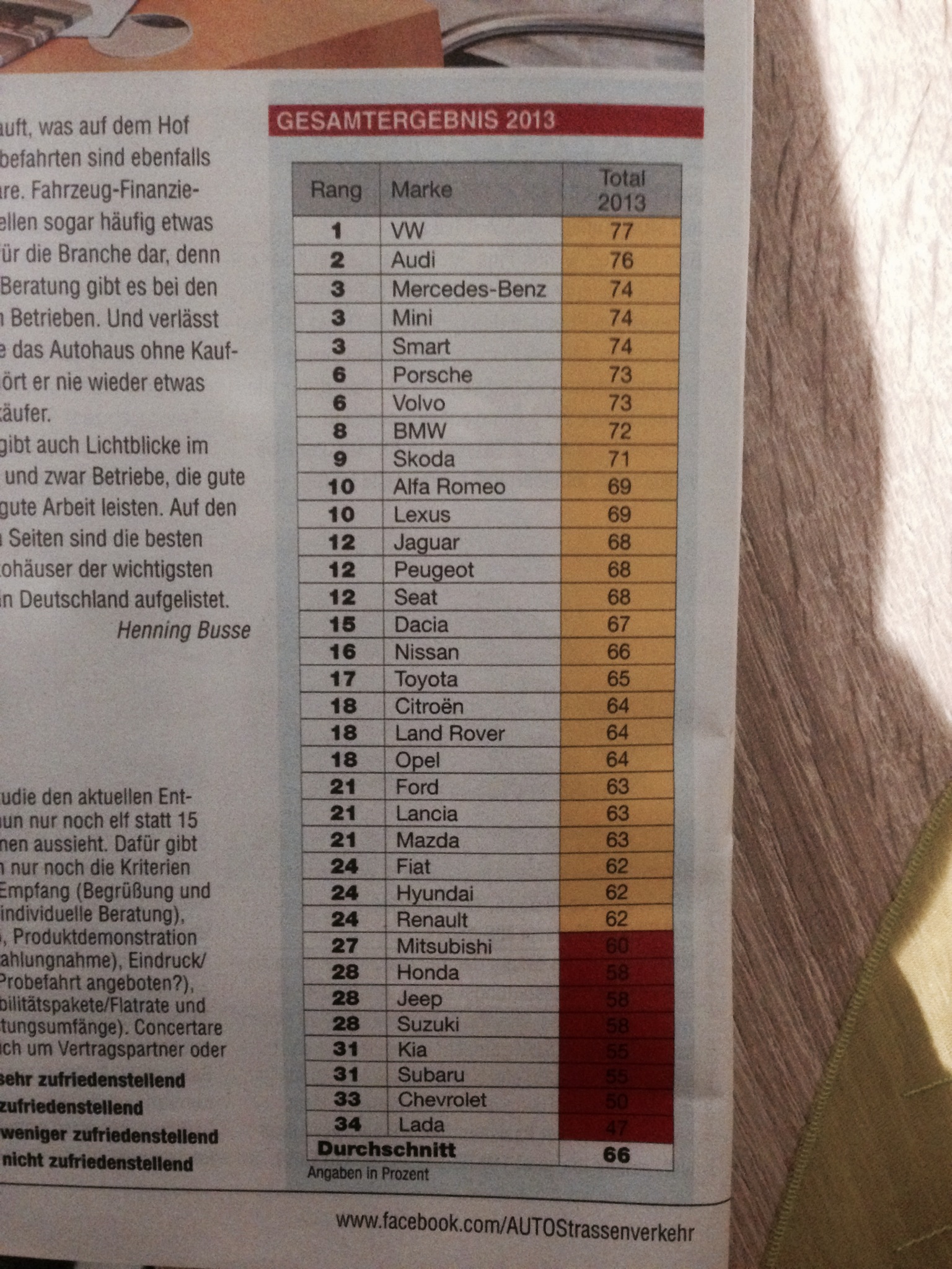 Im genannten Test ging es aber leider nicht um den Service der Autohäuser bzw, die Vertragswerkstätten der Automarken, sondern mehr um die Betreuung bei Neukauf, das Verhalten der müden Autoverkäufer, die nicht mal mehr aufstehen, wenn Du in eine Autohaus kommst, dich dann wie einen SEEMANN behandeln, und wenn Du was fragst oder Interesse bekundest nicht nachfasssen, wenn Du nicht ad hoc kaufst.