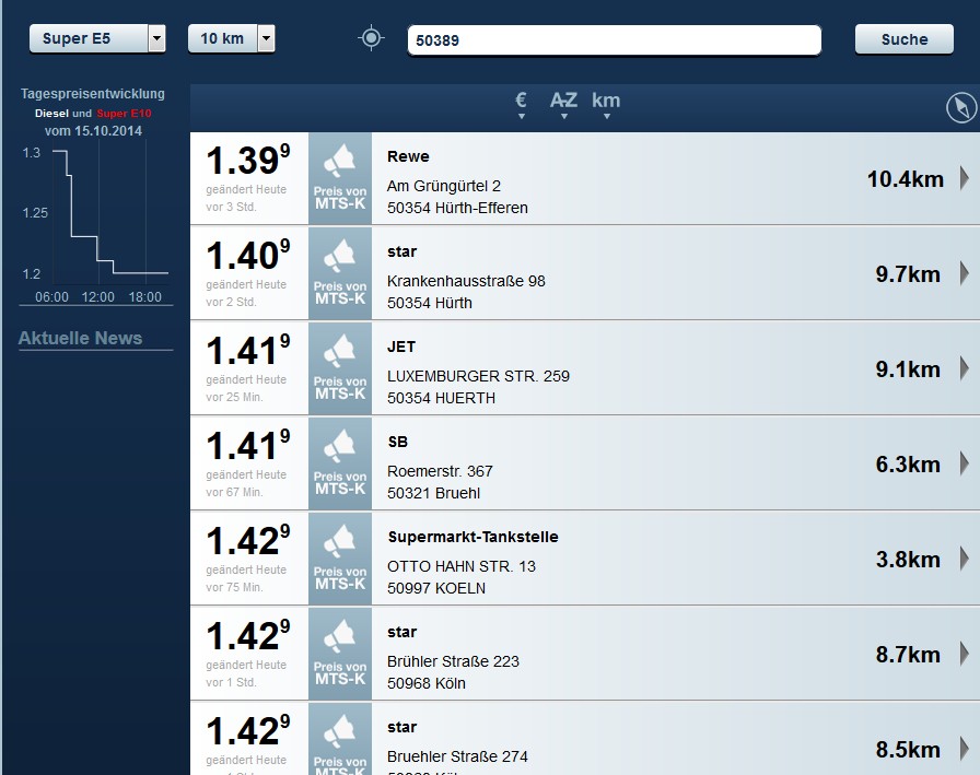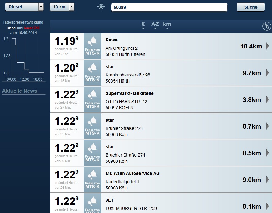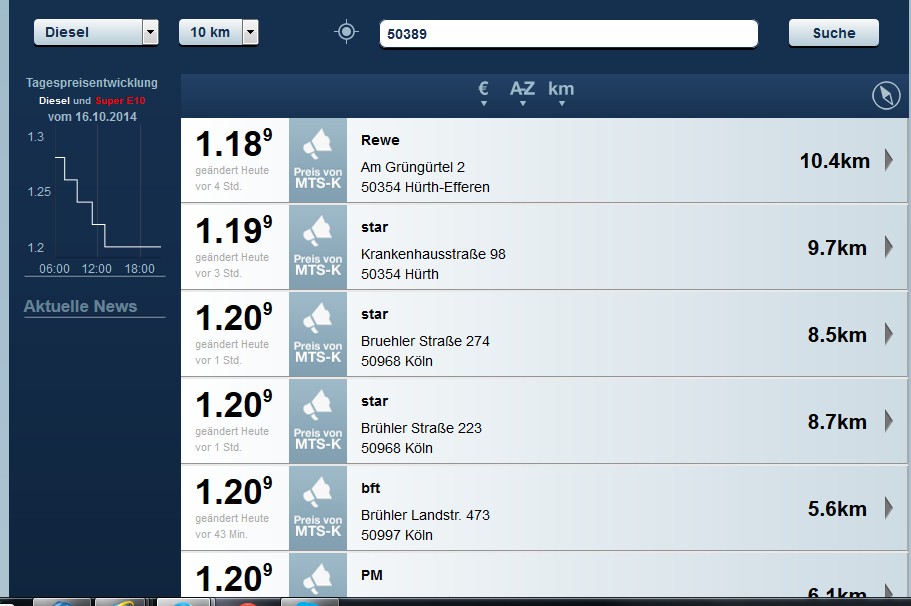 Waren es letzte Woche noch Preise, die beim Diesel beispielsweise an gewissen Tagen und besonders in den Abendstunden schon mal im Kölner Raum an die € 1,21 runter gegangen waren, so wurde heute an der gleichen Stelle heute morgen der Diesel für 1,22 € und jetzt um 17 Uhr für 1,19 feil geboten.