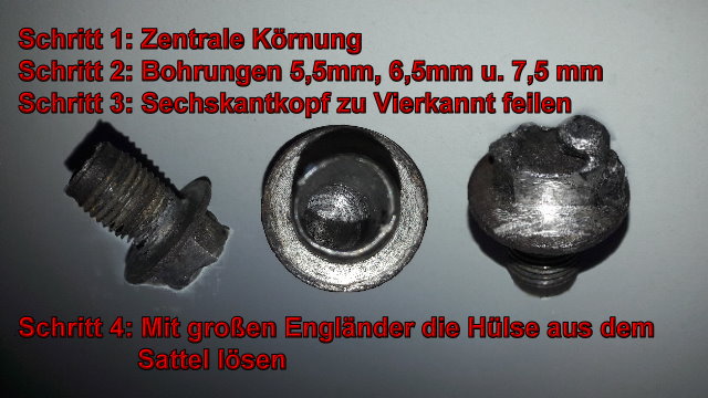 5. Bohrungen in 3 Schritten, erst 5,5 mm, 6,5 mm und dann 7,5 mm Bohrer benutzen, möglichst das Gewinde des Sattels schonen