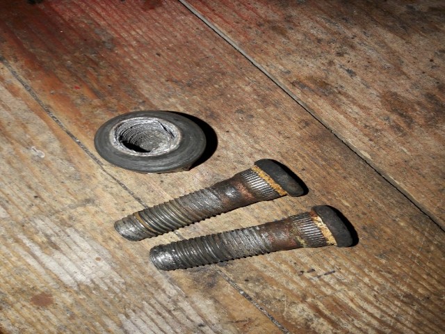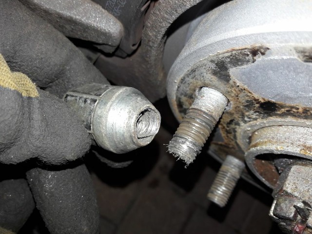 Mittels Schlagschrauber und hinterlegenden Druck mittels Brechstange konnten die 2 völlig zerstörten Radmuttern vom ebenso stark beschädigten Gewinde der Radbolzen mit dem Rad "abgezogen" werden.