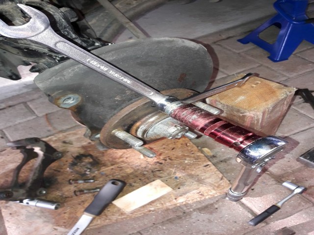 Die Not macht erfinderisch, ich nutzte einen Holzklotz als Gegenlager, zwei größere gerade Ringschlüssel, eine alte Radmutter und einen Drehmomentschlüssel.