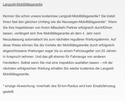 Mit jeder Wartung bei einem Mitsu-Vertragspartner verlängert sich die Mobilitätsgarantie bis zu nächsten regulären Wartungstermin, solange das Fahrzeug nicht älter als 20 Jahre ist.
