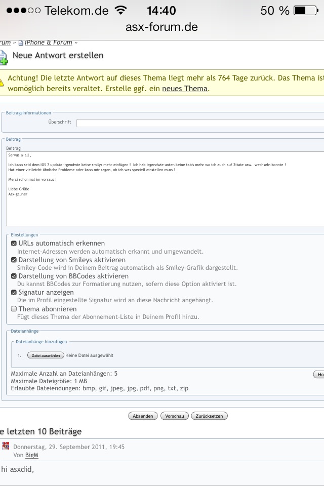 Ich kann seid dem IOS 7 update irgendwie keine smilys mehr einfügen ! Ich hab irgendwie unten keine tab's mehr wo ich auch auf Zitate usw. wechseln konnte !
