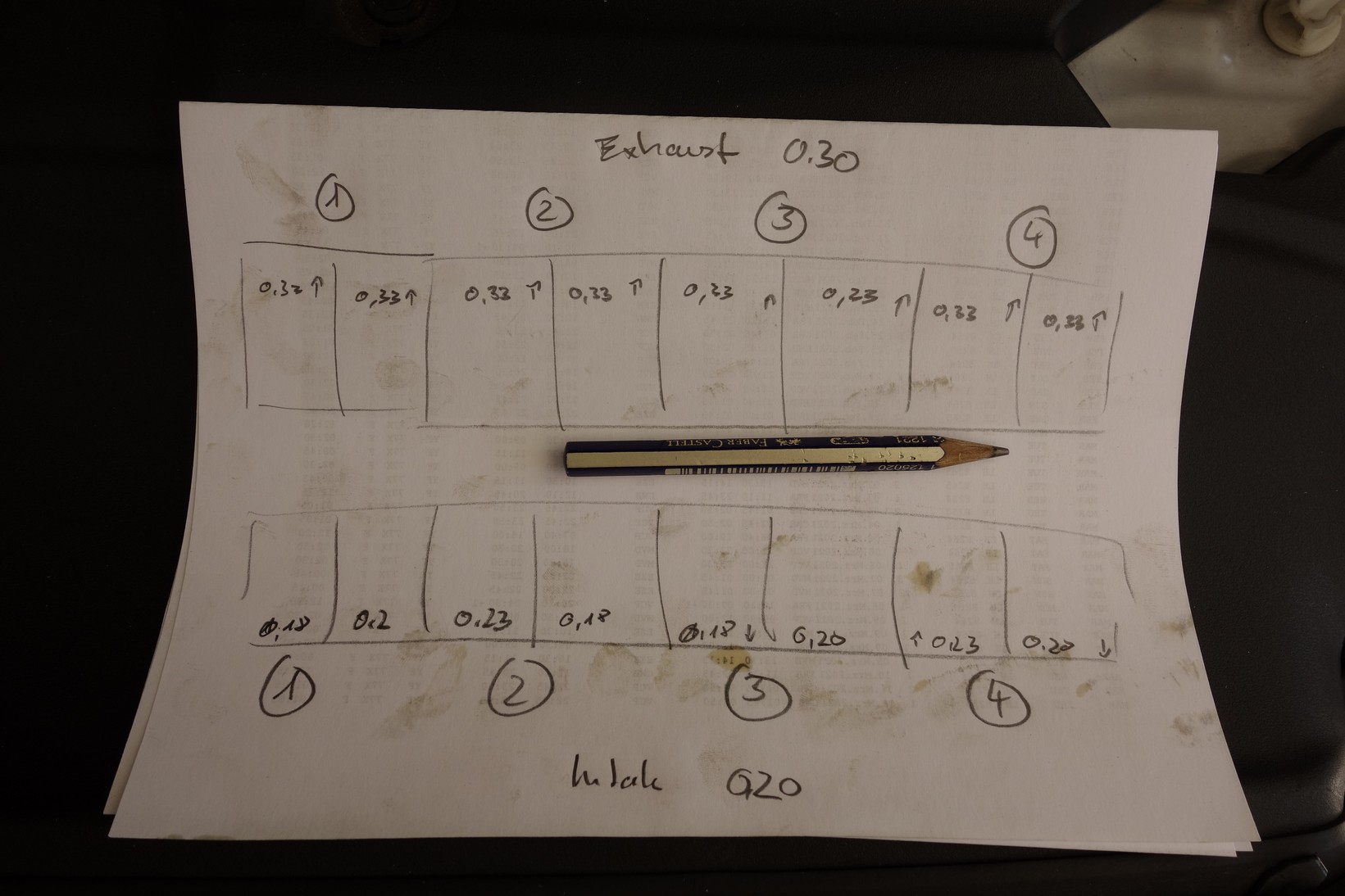 Man kann nun mal mit dem 0,20mm Blatt schauen, wie das durchgeht. Wenn das so leicht durchgeht (oder durchfällt) wie beim 0,15mm-Blatt, dann liegt das Spiel eher im Bereich von 0,23mm. Wenn das Blatt leicht schleppend und "schmatzend" passt, dann sind es genau 0,20mm und wenn ihr das Blatt grad so mit Gewalt reinwürgen könnt, dann sind es eher so 0,19mm-0,195mm. Geht das Blatt nicht zwischen Nocken und Stößel, ohne es dauerhaft zu verbiegen oder euch zu schneiden, dann liegen wir wahrscheinlich so bei 0,18mm.